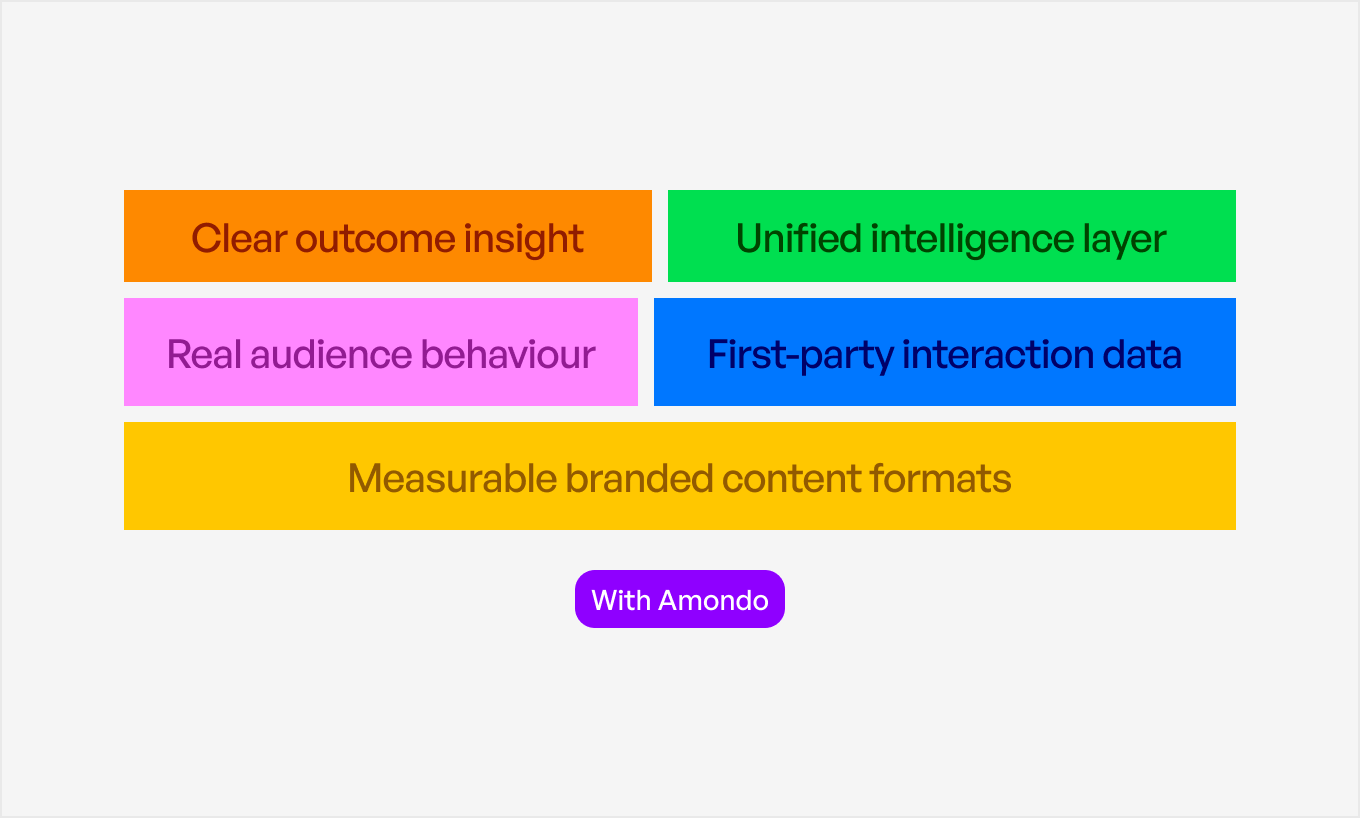 Amondo gives brands direct access to first-party behavioural data, revealing how people actually interact with content and what that behaviour means.